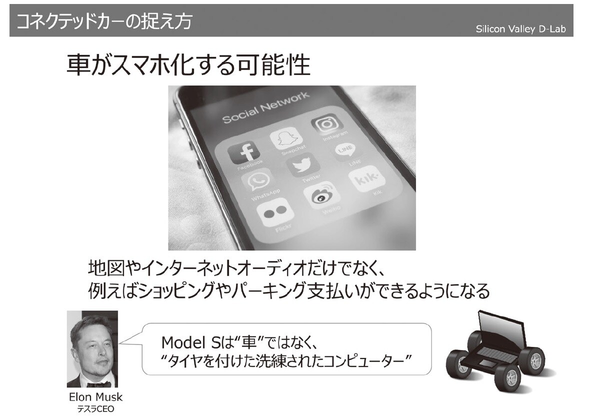 出所/シリコンバレーD-Lab第1弾リポートを改編(引用/ Los Angeles Times :Elon Musk: Model S not a car but a 'sophisticated computer on wheels')