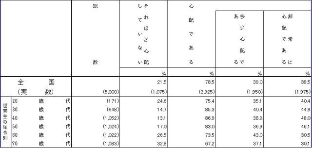 老後について〈心配である〉との回答は78.5%だった。年齢別にみると、20代が75.4%、30代が85.3%、40代が86.9%、50代が83.0%、60代が73.5%、70代が67.2%。30代~50代は、8割以上が老後が心配であるという結果となった。