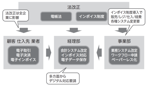 経理の仕事に最も大きな影響与えるのが、法律の改正です。電帳法改正(2022年)、消費税のインボイス制度の導入(2023年)は避けて通れません。使用している会計システムを、単純にバージョンアップすれば済む話ではないのです。社内外のあらゆる取引に影響を及ぼすからです。