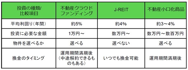 概要だけ簡単に解説すると、不動産クラウドファンディングはクラウドファンディングによって調達した資金を元手に不動産を購入する投資方法。J-REITは日本の金融商品取引所に上場している不動産の投資信託。不動産小口化商品は不動産を小口化して数万円から販売する商品です。