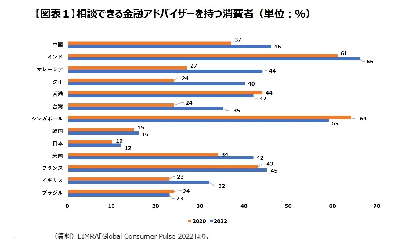 また、インド、シンガポールでは、過半数(2022年でそれぞれ66%、59%)が相談できるアドバイザーを現在持っており、現在アドバイザーがいない人でも、図表にはないが、うち約半数近く(それぞれ19%、22%)は、アドバイザーを探しているところ、と回答している。