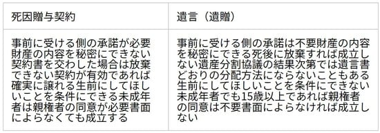 2つは似た制度に思えますが、比べてみると異なる点は多いです。中でももっとも大きな違いは、死因贈与は書面によらなくても口頭のみで契約が成立することに対し、遺贈の場合は遺言書を作成しなければ効果が生まれないことです。