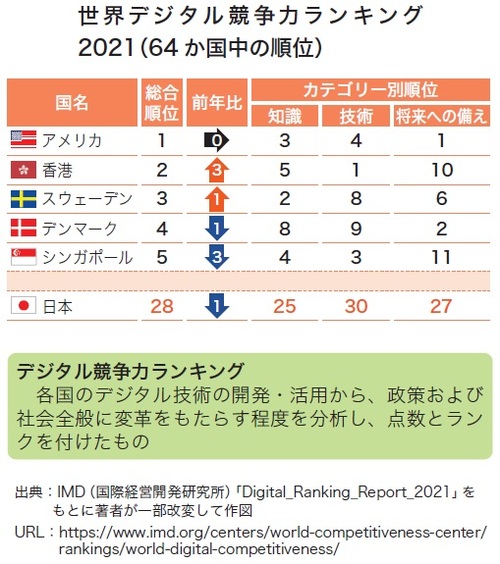 昨今、デジタル後進国と言われている日本について、データから確認します。紹介する「デジタル競争力ランキング」は、IMD(国際経営開発研究所)が公表している国際指標です。