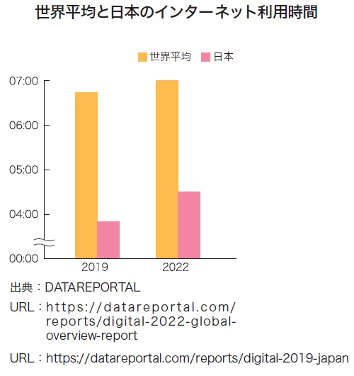 日本においても、コロナ禍によりネットショッピング、オンライン教育、テレワークなど、オンライン前提の新しい生活様式が定着しつつあります。しかし、2022年のインターネット利用時間においては、世界平均の6時間38分に対して、日本は4時間26分(世界平均の67%)にとどまっており差は大きい状況です(図表3)。