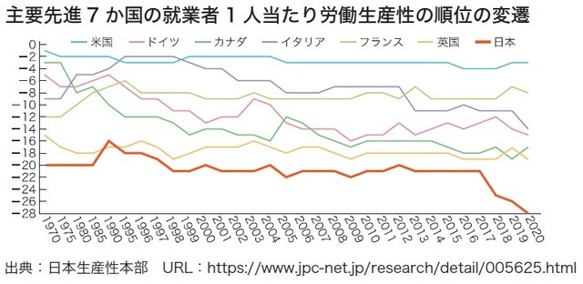 ●日本の1人あたりの労働生産性は、主要先進7か国で最下位