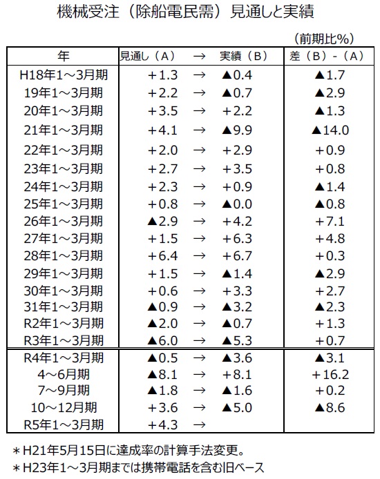 ●機械受注(除船電民需)の10~12月期は前期比+3.6%の見通しであったが、実績は前期比▲5.0%と見通しを大きく下回った。機械受注(除船電民需)の10~12月期・前期比実績は2009年(平成21年)から21年までの13年間でみると、上振れ9回、下振れ4回と上振れしやすい傾向にあったものの、22年は下振れた。