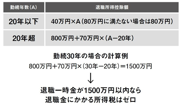 退職金は一括で受け取る場合、給料とは別に優遇された税制が適用されます。それが上記の[図表1]の計算です。退職所得控除は勤続年数が長いほど控除額が増えるしくみになっています。