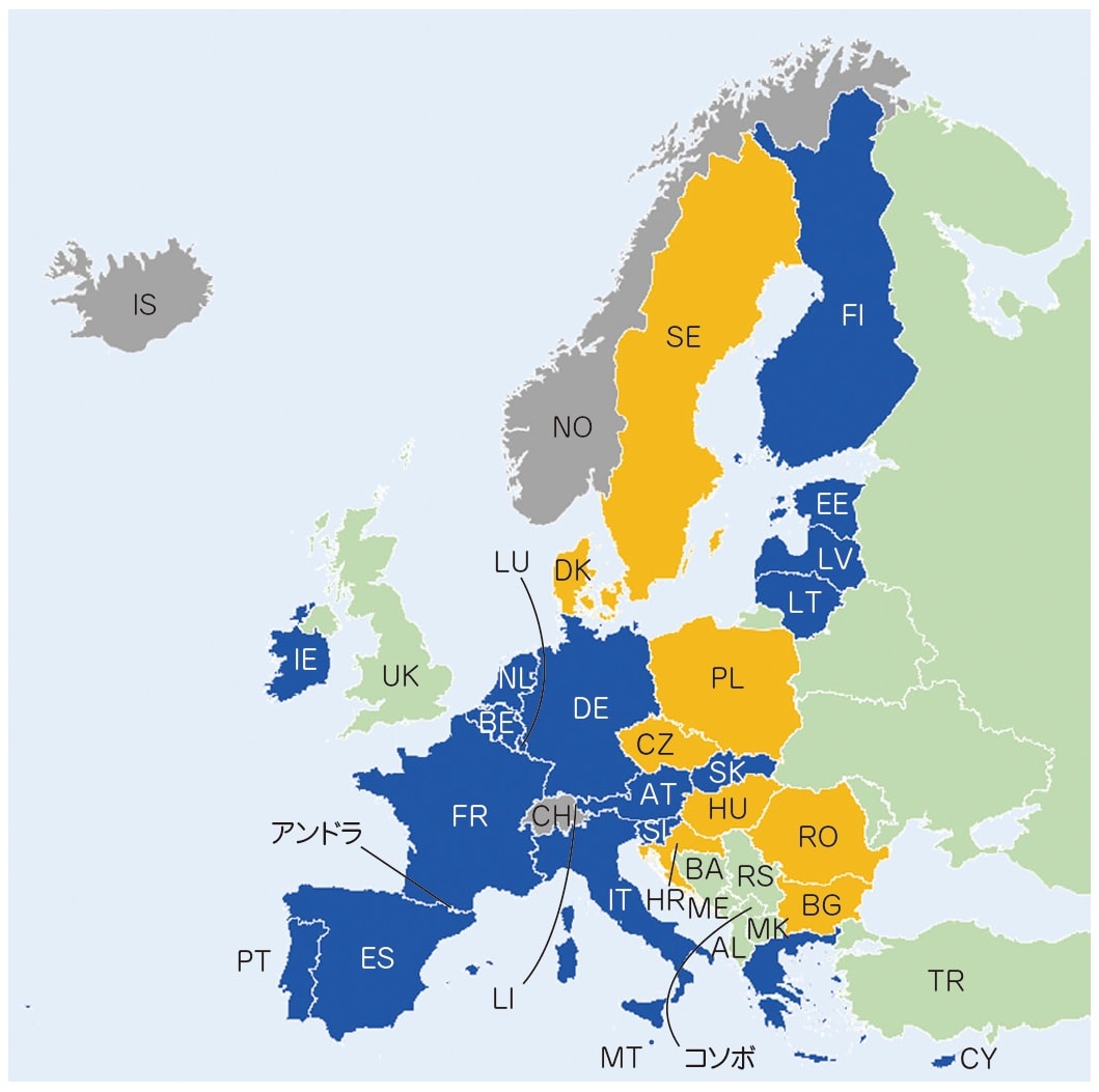 ※1 モンテネグロ、アンドラ、モナコ、サンマリノはEUに加盟していないがユーロを使っている。ユーロ地域にこれらの地域を加えた領域をユーロ圏(euro zone)という。