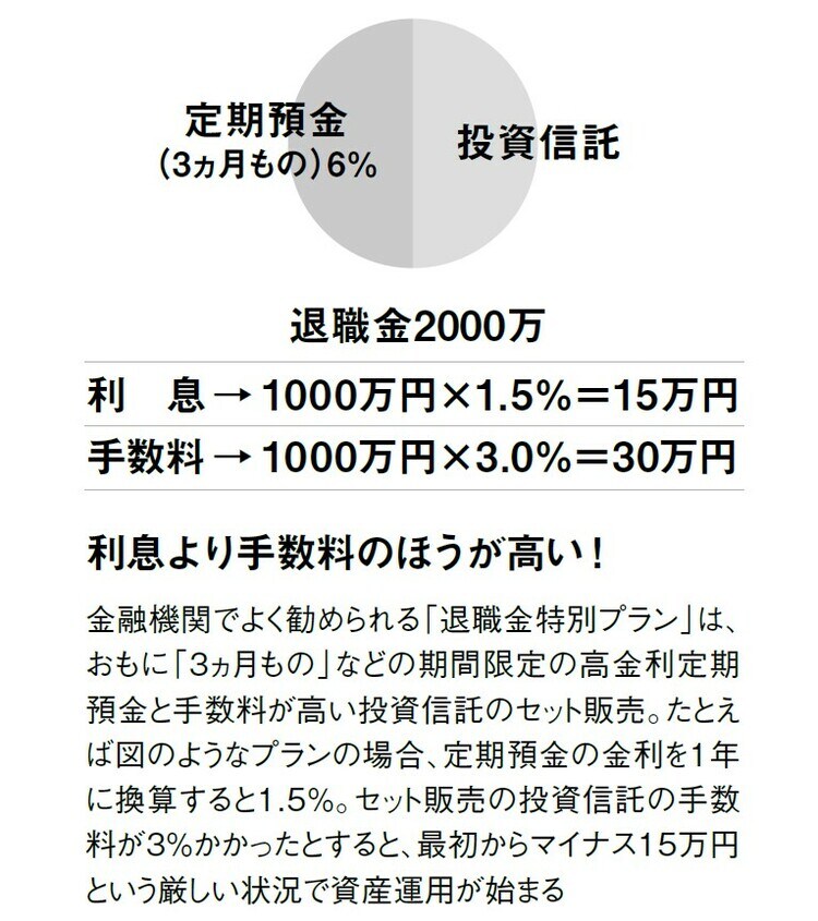 退職金が入ると、まず勧められるのは「退職金特別プラン」です。これは、定期預金と投資信託を組み合わせた商品です。その特徴は、定期預金に6%とか7%といった高い金利がついています。この金利はよく見ると「3ヵ月もの」など期間限定です。