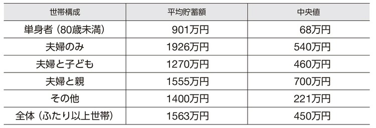 中央値で先ほどの数値を見ると、単身者世帯は68万円、ふたり以上世帯は450万円まで下がります。