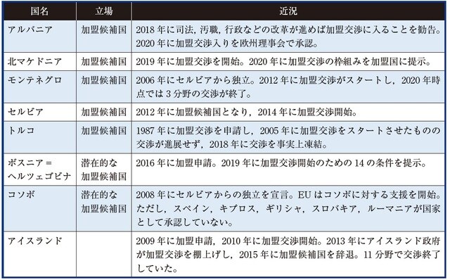 EU拡大では現在5カ国が加盟候補国であり、加盟交渉が開始された国もある。コペンハーゲン基準を満たし、35分野で法改正を行ってEUのアキコミュノテールを国内法として導入する必要がある。