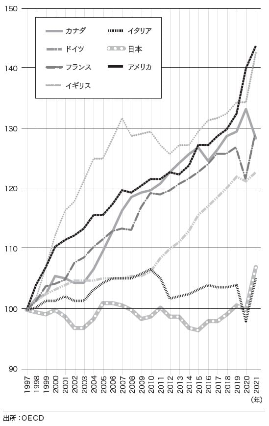 多少の変動はあるものの、日本ではこの25年間、賃金がほとんど変わっていないことがわかります。これに対して、アメリカやイギリスでは賃金は約1.4倍に、カナダやフランスは約1.3倍に、ドイツも約1.2倍になっています。