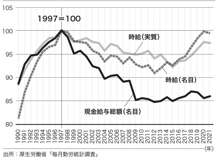 また、1997年の実質賃金を100として基準化した指数で表しています。