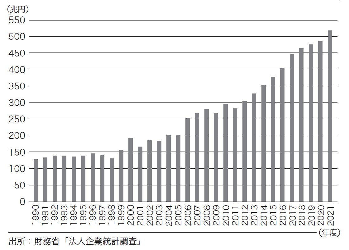 内部留保は2000年代に入ってから増え続けていることがわかります。2021年度には約516兆円と初めて500兆円を超え、2000年度の内部留保(約194兆円)の約2.7倍となっています。2021年度の名目GDPは542兆円なので、内部留保額はGDPの約95%に匹敵する大きさです。