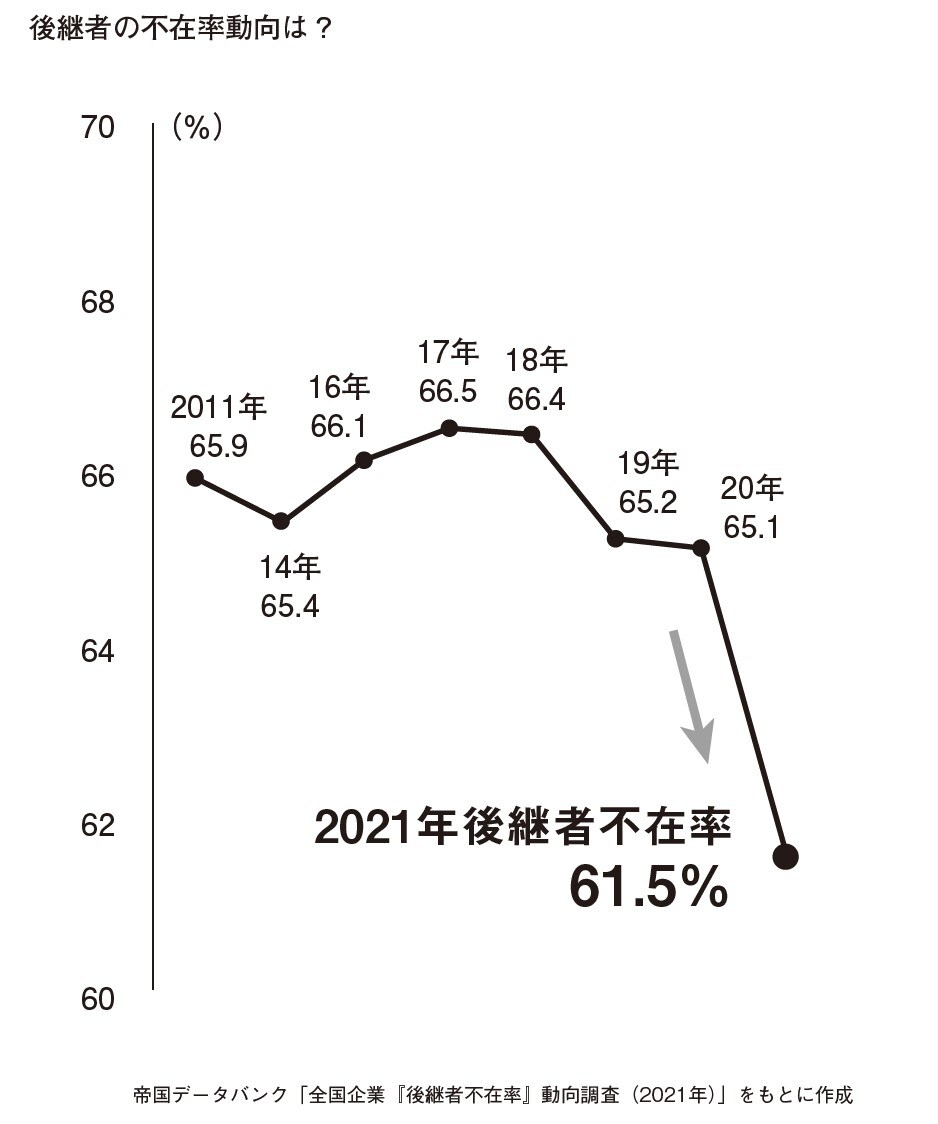いまや、中小企業の後継者不足が深刻な社会問題となっています。帝国データバンクの「全国企業『後継者不在率』動向調査」によると、2020年までの企業の後継者不在率は、65%程度で推移しています[図表]。