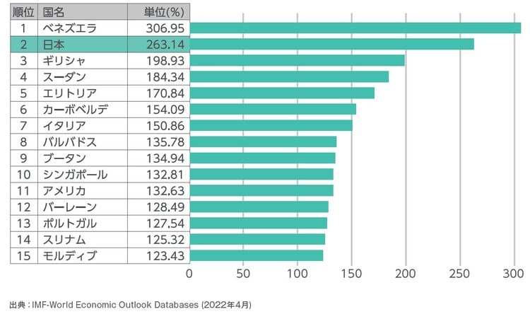 GDPに対する比率で見た世界の借金ランキングを見ると、日本は第2位。先進国ではアメリカにおよそ2倍の差をつけて圧倒的第1位となります。