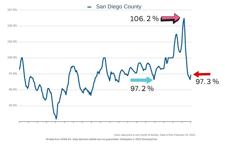 たとえば売り出し物件価格がUS$500,000(**5,000万円)で、最終的に物件がUS$500,000(**5,000万円)で売れた場合を100%とします。2022年4月は106.2%でした。つまり売り出し価格より6.2%高く売れたことになります。2023年1月は97.3%でしたので、実際には売り出し価格より約2.7%低い金額で売却されたことになります。