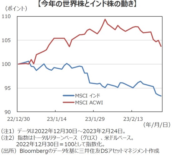 ■今年に入り、世界の株式市場はリスクオン(選好)の動きで急反発しましたが、足元では米利上げ停止が遠のくとの見方からやや調整しています。こうしたなか、インド株は出遅れ感が目立っています。世界の株式の動きを示すMSCI世界株指数(MSCI-ACWI)の年初来騰落率は+4.0%となる一方、インドの株価指数(MSCIインド)は▲6.4%と沈んでいます(2月24日時点)。