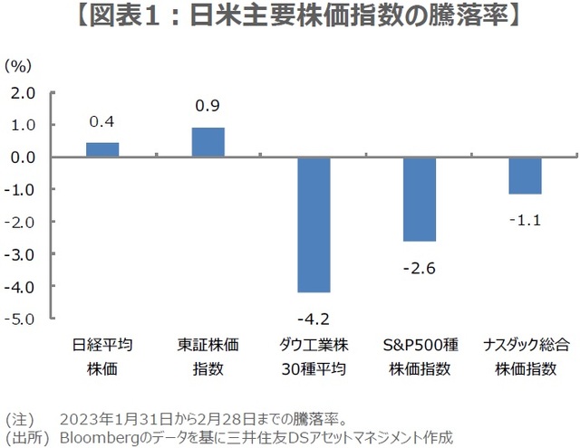 2月は、ダウ工業株30種平均など米主要株価指数が軒並み下落した一方、日経平均は膠着感の強いなかでも0.4%上昇したため、相対的には底堅い動きとなりました(図表1)。なお、日経平均株価を構成する225銘柄のうち、2月に株価が上昇したのは138銘柄、下落したのは84銘柄、変わらなかったのは3銘柄でした。上昇した138銘柄は全体の61.3%を占め、このうち上昇率が2ケタとなったのは24銘柄、全体の10.7%となりました。