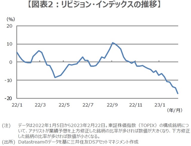 実際、アナリストによる業績予想の傾向を示す「リビジョン・インデックス」に目を向けると、足元では業績予想を下方修正した銘柄の割合が増加し続けていることが分かります(図表2)。今後、業績予想が改善するためには、やはり海外経済の先行き不透明感を払拭する材料が必要であり、具体的には、米国のインフレ沈静化と利上げ終了が見通せるような状況や、中国の景気回復が鮮明となる状況などが考えられます。
