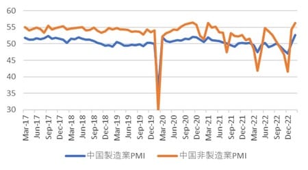 中小企業を対象とする財新製造業PMIについても7ヵ月ぶりに「50」を上回り、昨年6月以来の高水準を回復した。建設業とサービス業を対象とする非製造業PMIは56.3と21年3月以来の水準まで回復した。