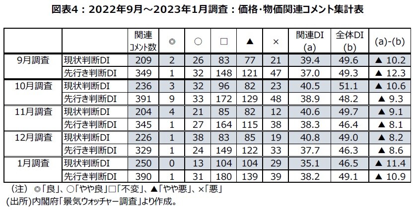 一方、物価高による悪影響など相変わらず懸念材料は多い。「価格or物価」関連DIを算出すると、22年では、現状判断DIは2月に30.1と年内で一番低い水準になった。その後9月の39.4まで30台、10月~12月までは40.0を小数点第1位で僅かに上回る水準になったが、23年1月で35.1と再び30台に落ち込んだ。先行き判断DIは22年では12ヵ月全てで30台と、景気判断の分岐点50をかなり下回る弱い数字になった。23年1月も38.2と30台が継続している。コメント数は、22年中で現状判断が最多なのは10月の236件、10月は食品値上げ品目数が最多だった。23年は1月で早くも250件になった。先行き判断は6月の410件が最多、12月は329件だった。23年は1月で390件になった。コメント数の動向からみて、22年は年初「価格or物価」判断の寄与度はそれほど大きくはなかったが、22年末から23年初にかけ寄与度は大きくなり、価格高騰の影響が景況感に影を落としていることが感じられる(図表4)。