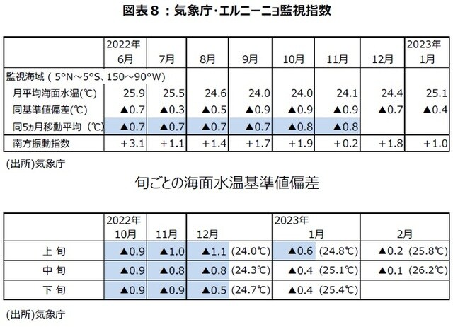 気象庁・エルニーニョ監視指数は2月中旬▲0.1℃で平常状態の範囲に入っている(図表8)。