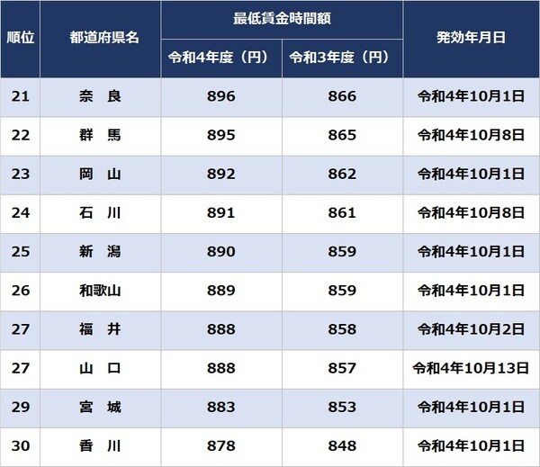 都道府県「最低賃金」ランキング21~30位
