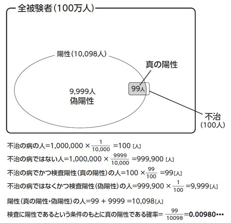 結局100万人の中には、正しく陽性である人と偽陽性である人とを合わせて計1万98人の「陽性」の人がいますが、この中に本当に陽性である人は99人しかいません。結局「検査に陽性である」という条件のもとで、本当に不治の病であるという条件付き確率はわずか0.98…%です。