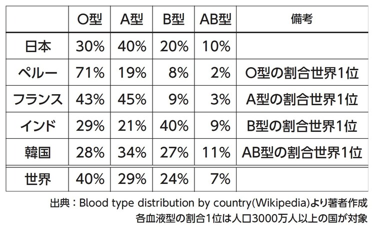 日本では、O型の人は全体の30%ですが、たとえばペルーではO型の人の割合は71%にもなります。