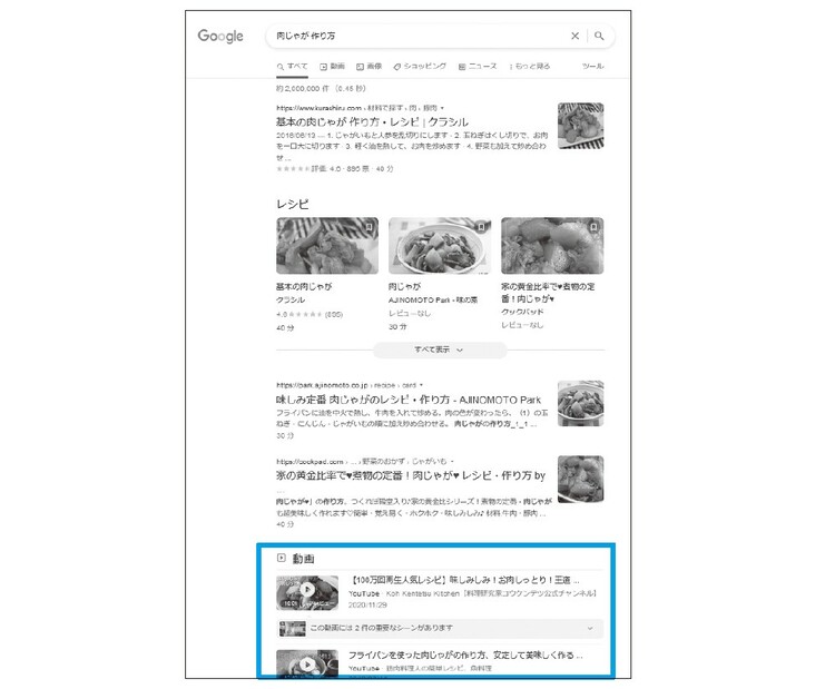 たとえばGoogleで「肉じゃが 作り方」と検索すると、いくつかの有名レシピサイトに続いて、YouTubeの動画コンテンツがかなり上位に表示されます。