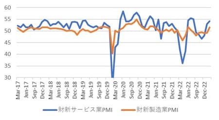 一方、昨年12月からゼロコロナ政策を劇的に転換したことで3月のPMIは製造業・非製造業がそろって大幅な改善がみられたことは中国経済の期待の表れでもある。3日に発表された財新のサービスPMIでも2月は55.0と購買力が回復し、雇用も堅調な伸びを記録した。市場の状況改善を受けて雇用は20年11月以来の拡大ペースだった。