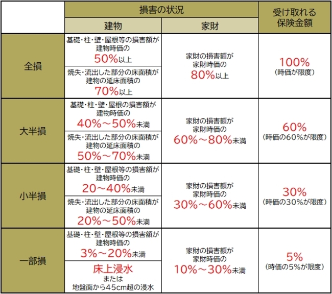 地震保険の補償内容は、建物、家財それぞれについて損害の程度を「全損」「大半損」「小半損」「一部損」の4段階に分け、それに応じて保険金を受け取れるしくみになっています(【図表1】)。