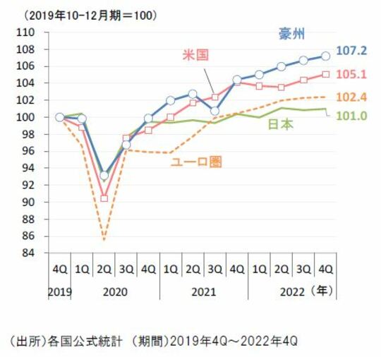 一方、豪州景気に関しては、2022年10-12月期の実質GDPは前期比+0.5%に小幅鈍化しました(前期は+0.7%)。もっとも、主要国の中では、10-12月期の豪州の経済成長率は米国に次ぐ底堅さを示しており(図3)、豪州はコロナ後の景気回復で引き続き先行しています(図4)。