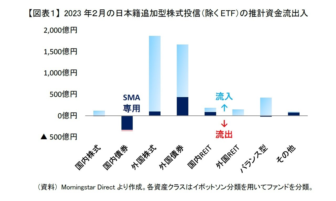 2023年2月の日本籍追加型株式投信(ETFを除く。以降、ファンドと表記)の推計資金流出入をみると、2月は主に国内債券を投資対象とするもの以外すべての資産クラスのファンドに資金流入があった(図表1)。ただ、ファンド全体でみると4,100億円の資金流入と1月の5,200億円から1,100億円も減少した。