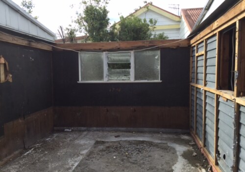 スパの下はコンクリートで固まっていたので、解体に苦労したそうです。屋根を取り、下の空間は空洞にします。下記の写真左手がバーのある倉庫で、右はガレージとなる予定です。