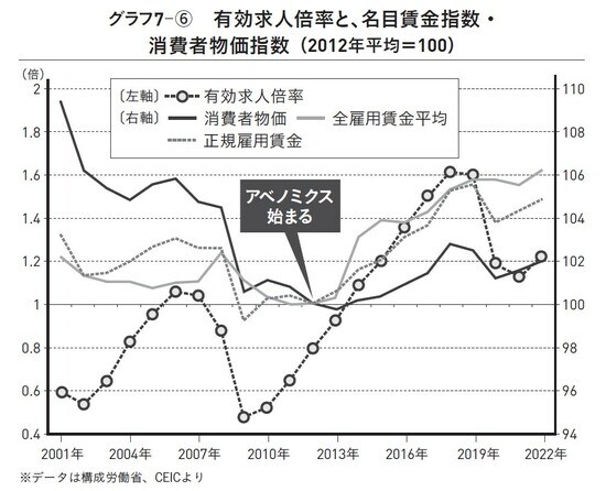 グラフ7-⑥はアベノミクスを挟んで、求人倍率、賃金、物価を詳細に追っています。