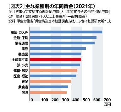 賃金に関して言えば、とりわけ観光関連産業における賃金水準は低位に留まっている。2021年の一人当たり平均賃金を見ると、観光との関わりが深い宿泊業や娯楽業、運輸業の平均賃金は全産業平均を下回り、特に宿泊業や娯楽業では7~8割の水準に留まっている。21年はコロナ禍の悪影響を受けていた面もあるとはいえ、これらの業種の賃金が相対的に低いという状況は長らく変わっていない(図表2)。
