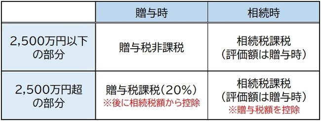 2,500万円までの生前贈与について、贈与税が課税されません。また、2,500万円を超えた部分については、贈与税の税率が20%と低く抑えられます。