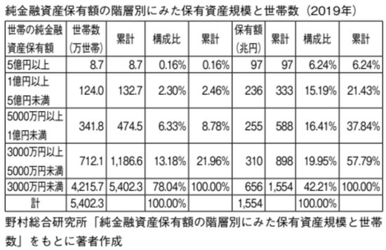 さらに具体的に検討してみよう。表は、野村総合研究所の「純金融資産保有額の階層別にみた保有資産規模と世帯数」(2019年)をもとに試算したものである。