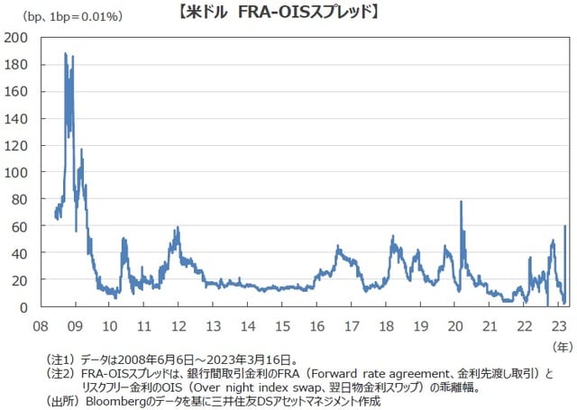 ■市場で金融不安が高まるなか、米金融機関の信用リスクを示す「FRA-OISスプレッド」は急拡大しています。ただ、ヒストリカルにみると、過去10年では高水準にあるものの、2008年のリーマン・ショックのレベルには遠く及んでいないことがわかります。リーマン・ショック後、金融当局の銀行に対する規制が強まり、銀行の財務安定性が高まったことが背景にあるとみられます。