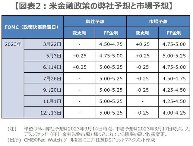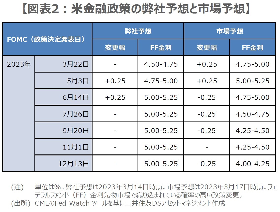 具体的には、5月と6月に25bpの利上げを行い、フェデラルファンド(FF)金利の誘導目標が5.00%~5.25%に達したところで年内据え置きを予想しています。直近のFF金利先物市場の織り込みとは異なる見通しですが(図表2)、いずれにせよ今回は、FOMC声明でも、パウエル議長の記者会見における発言でも、過度なタカ派姿勢を示して金融市場を動揺させることは避けると思われます。