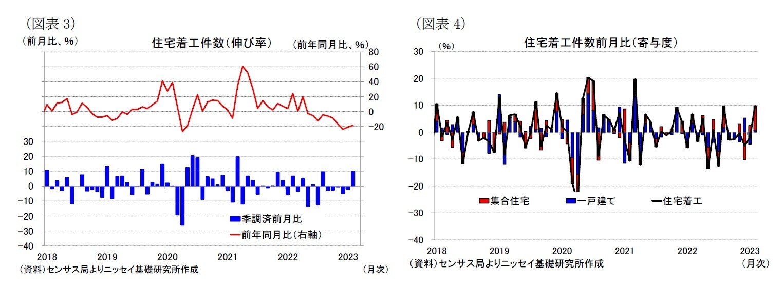 住宅着工件数の伸びは前月比+9.8%(前月▲2.0%)と6ヵ月連続ぶりにプラスに転じた(図表3)。戸建てが+1.1%(前月:▲6.8%)とプラスに転じたほか、集合住宅が+24.0%(前月:+7.1%)と2ヵ月連続のプラスとなったほか、増加幅が大幅に拡大した(図表4)。