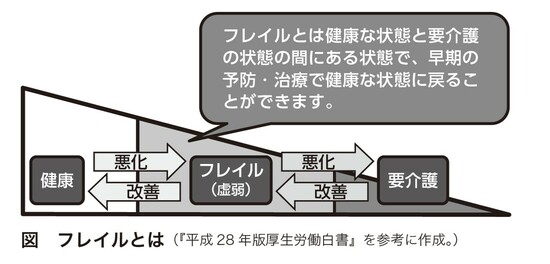 フレイルとは「虚弱」という意味で、年をとって身体や脳の機能が衰えつつあり、心身の活力が低下した状態です。具体的には「歩くスピードが遅くなった」「お茶などを飲むとむせる」「昨年と比べて外出回数が減った」などが挙げられます。健康と要介護の間で、また健康の状態に戻ることもできる状態です(図参照)。