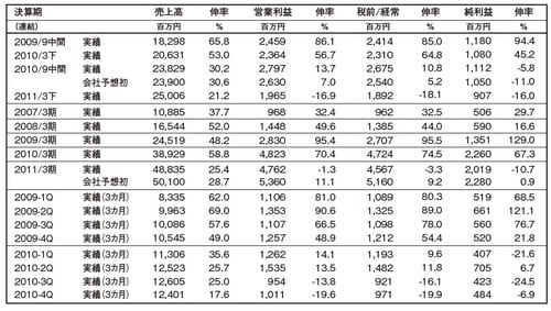 第1四半期の業績(表の下から4行目の2010-1Qの欄)は35.6%増収、14.1%営業増益でした。上期の会社計画は30.6%増収、7.0%営業増益でしたから、そのピッチは上回っていました。
