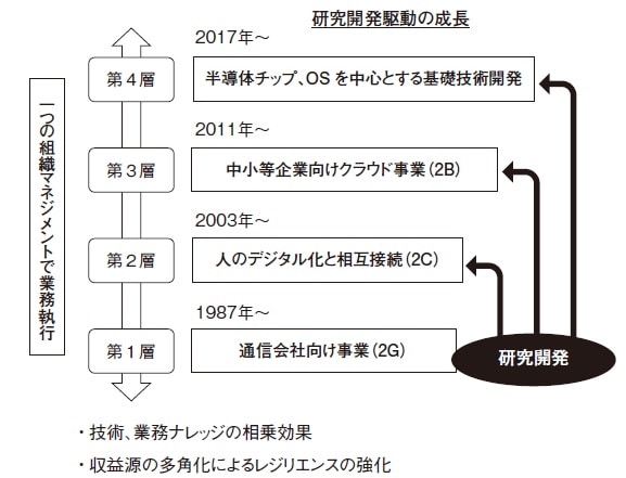 ファーウェイのビジネスモデルの特徴は、技術開発力を基盤として、異なる組織能力が求められる事業を一つの人材組織マネジメント体系のもとで経営し、各事業が相乗効果を発揮することにある。1987年の創業から、次の4層(レイヤー)を順次追加して各レイヤーで成長のサイクルを回し、さらにレイヤーが補完し合うことで好循環をつくっている。
