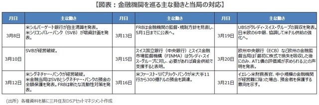 米国のケースで特筆すべきは、金融当局の対応の早さです。米財務省、米連邦準備制度理事会(FRB)、米連邦預金保険公社(FDIC)は3月12日、SVBなどの預金の全額保護を発表し、FRBは新たな流動性対策を公表しました。また、イエレン米財務長官は21日、中小規模の金融機関が経営難に陥った場合、預金者を保護する意向を示すなど、金融当局は「流動性供給」と、状況に応じた「預金保護」により、金融不安の払拭に努めています。