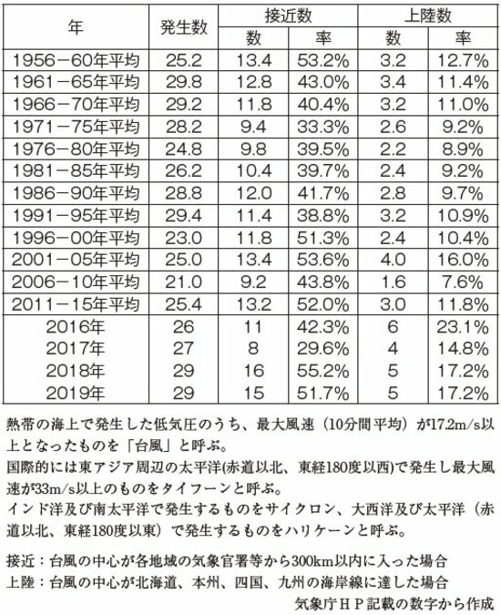 また太平洋に面した弧状列島であることから台風の直撃や、最近は異常気象による風水害、さらには豪雪も多い。特に台風については、毎年30近く発生しているが、そのうち半数は日本に接近し、さらに10%以上が上陸している[図表2]。