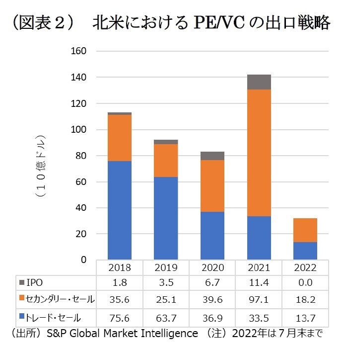 ここで特徴的なのは、株式市場を通じたIPOが過半数を占めると言われる日本に比べ、北米では、株式市場を介さないセカンダリー・セールやトレード・セールのシェアが高いことだ。