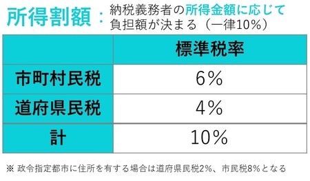 所得割額は、前年の所得金額に応じて課税され、前年所得金額から所得控除額を控除した金額に、10%をかけた金額となります。内訳は道府県民税が4%、市町村民税が6%です。税額控除があれば、そこから控除します。